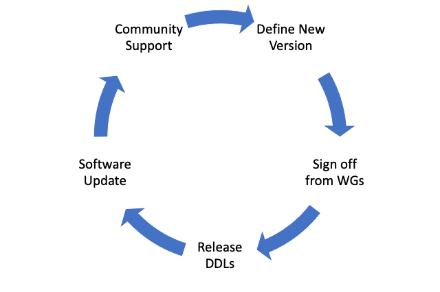 In addition to documentation the formal remit of the CDM Working Group (WG) is to hear proposals for change, ratifying only those with valid use cases and data to support them. In the past, this was done by the WG alone. The group would invite others from around the community to present use cases for change and suggestions for improvement. The WG would then vote on the proposals and a new CDM version would be released after a certain period of time or if enough proposals were voted in. This approach worked when the community was smaller but as it is growing rapidly the CDM WG needed to adapt the refresh cycle such that everyone has an opportunity to weigh in on the proposed changes.